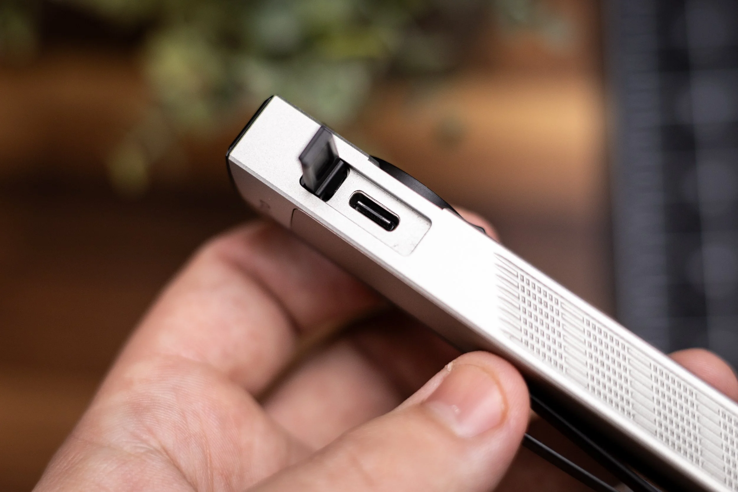 First off I was extremely impressed with the fit and finish of this flashlight. I am normally a standard black flashlight person but as soon as I pulled this thing out of the box I was mesmerized be the dual color of what Olight is calling their Silver Graphite color option. I began examining the light and noticed in many ways it was still very similar to its predecessor, the Arkfield Pro that I have been a fan of for years now. Then I saw it… I lifted the, for lack of better words, the door on the side of the flashlight and there it was, A USB-C charging port. This really caught me off guard. It even caused me to flip the light around and to look and check if they were even still including their proprietary magnetic base charger. It was still there of course, they just decided to listen to the EDC community and give us what we had been asking for, for what seems like forever now.